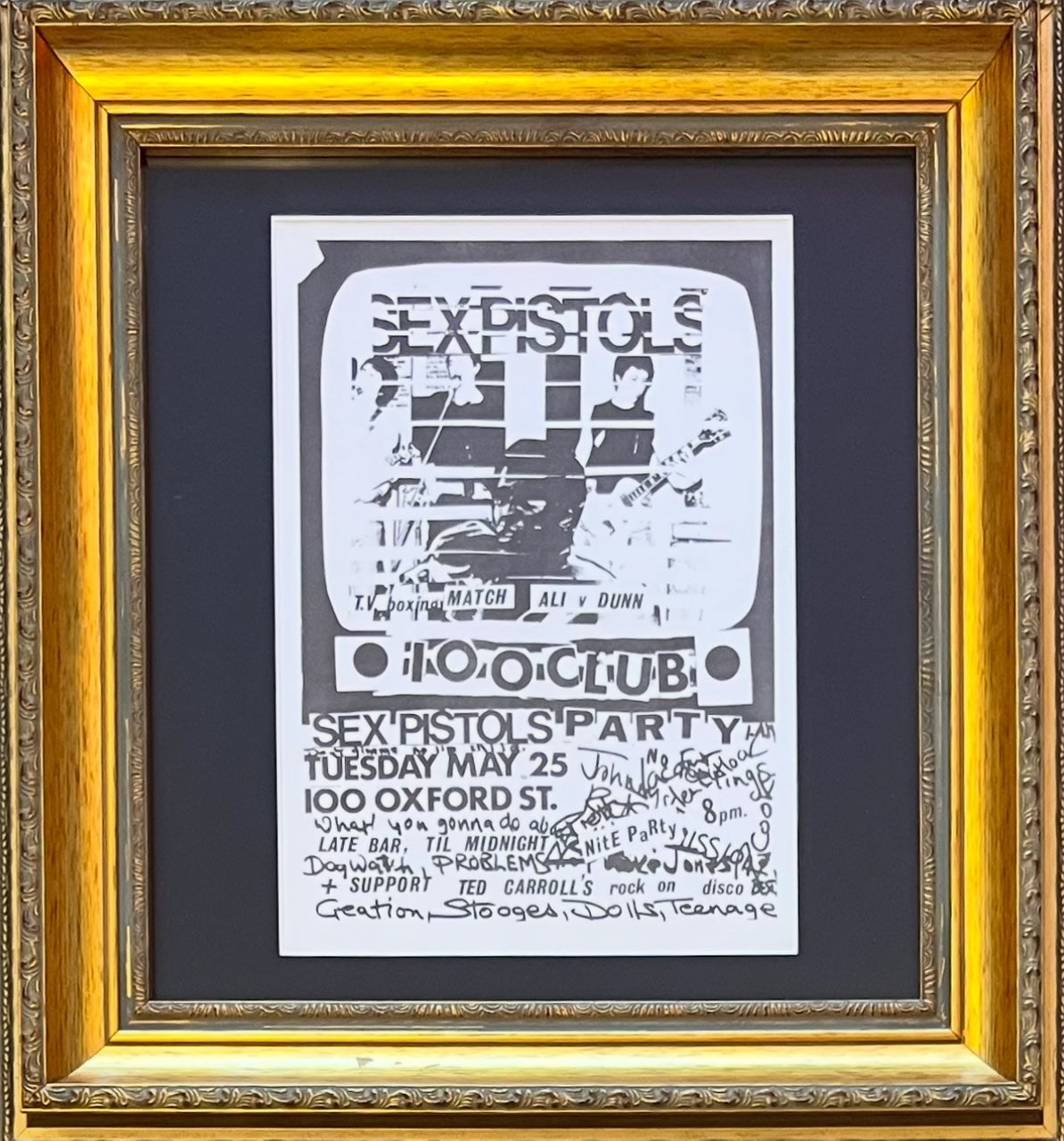 Rare original promotional gig flyer for the 25th of May 1976 from Ted Carroll who DJ'd regularly at Sex Pistols' shows and promoted the band through his record shop 'Rock On'. From the personal collection of Eddie Lock. Comes with Certificate of Authenticity from Ted Carroll and Eddie Lock.