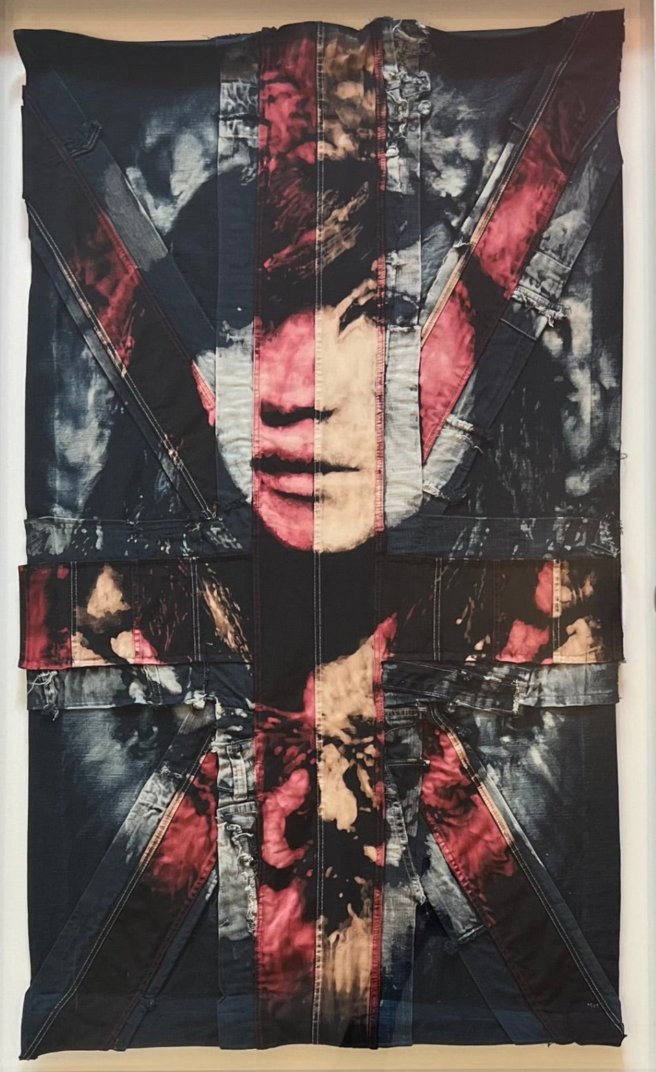 British mixed media artist Pam Glew is recognised for her distinctive use of vintage fabric and flags as her base bleached canvases.